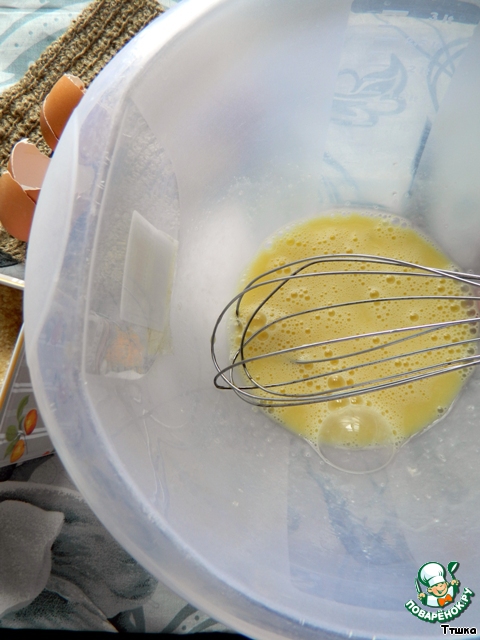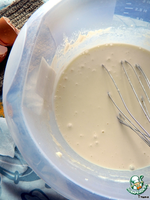 Начнем с блинов. Два яйца взбить с помощью венчика.
