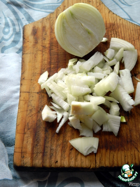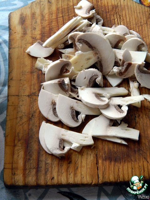 Лук и грибы обжарить в растительном масле до золотистого цвета. Добавить соль, специи (я использовала черный молотый перец, розмарин, тимьян) и посолить.