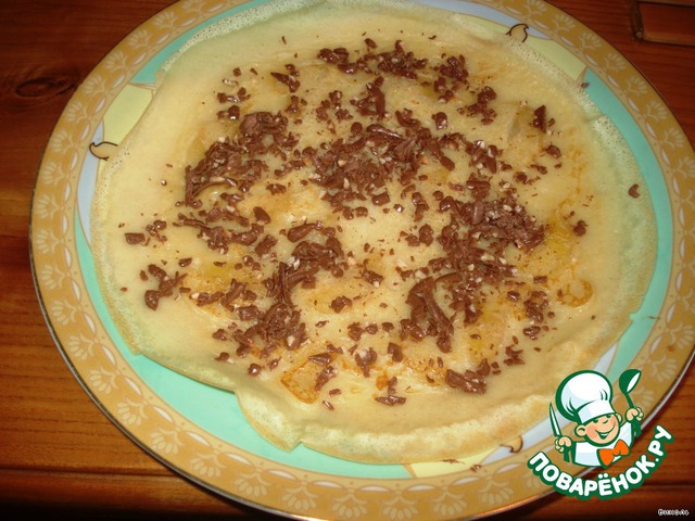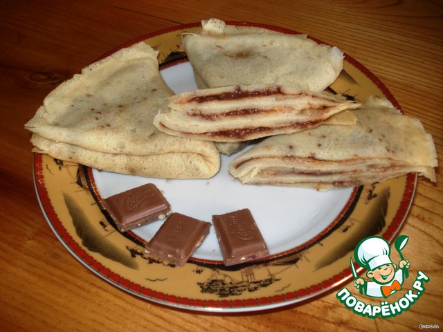 Горячий блин с бананом присыпала натертым шоколадом и свернула треугольником. От себя добавлю, что шоколад с измельченными лесными орехами намного лучше смотрелся с такими блинчиками, чем без добавок.