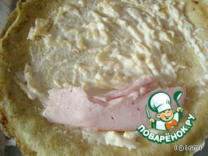 На первый сгиб блинчика кладем кусок грудинки.