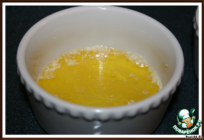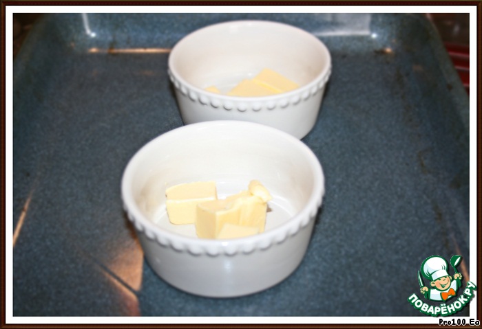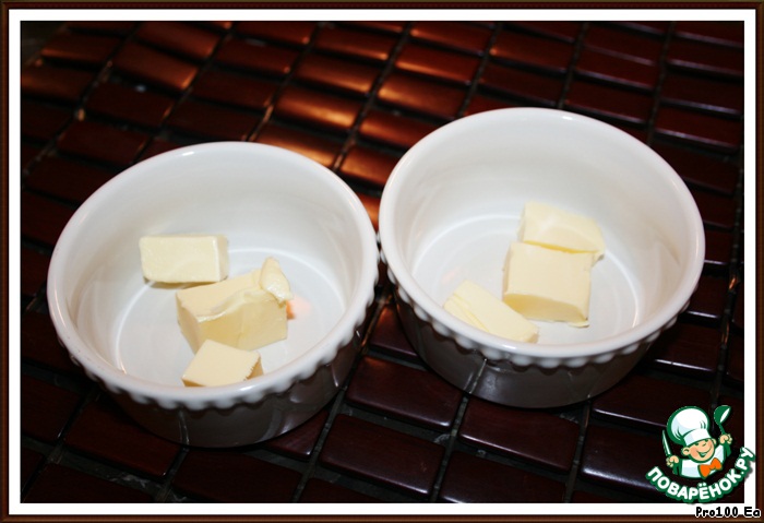 1. Сливочное масло разделить на две части и поставить в двух маленьких формочек для выпечки (ёмкость - 2 стакана).