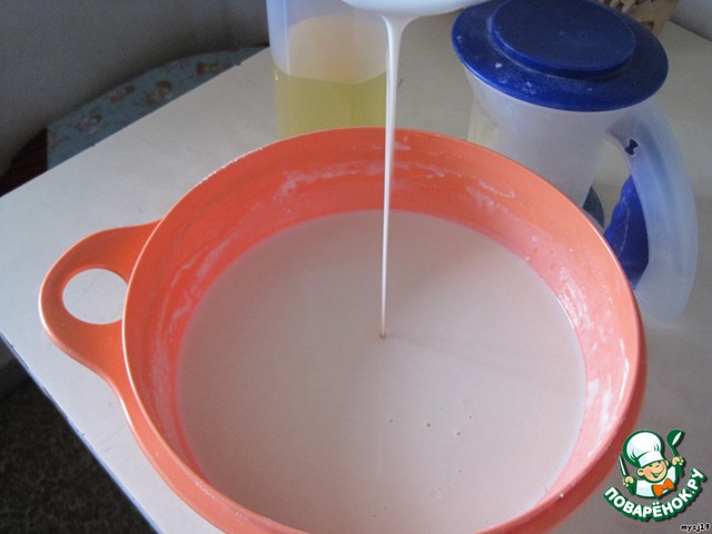 Взбиваем яйца с сахаром и солью. Просеем муку, т. к. она обогащается кислородом и, постепенно, вводим в яйца. Немного муки и немного молока. Молоко должно быть теплым. Когда вся мука замешана, доводим до нужной консистенции при помощи молока. Добавляем сметану, она делает тесто более вкусным. В самый последний момент добавляем масло, т. к. оно мешает пенообразующей способности яиц и тесто не будет насыщенно воздухом, блинчики не будут «ноздрястыми». Тесто должно быть самым жидким и литься из половника тонкой непрерывающейся лентой, как проверяют мед на качество - очень важно!!!! Оставляем тесто в покое на полчаса. В это время включается в работу клейковина, иногда тесто густеет, это можно исправить путем добавления молока или даже воды. Никогда не добавляю в тесто соду.