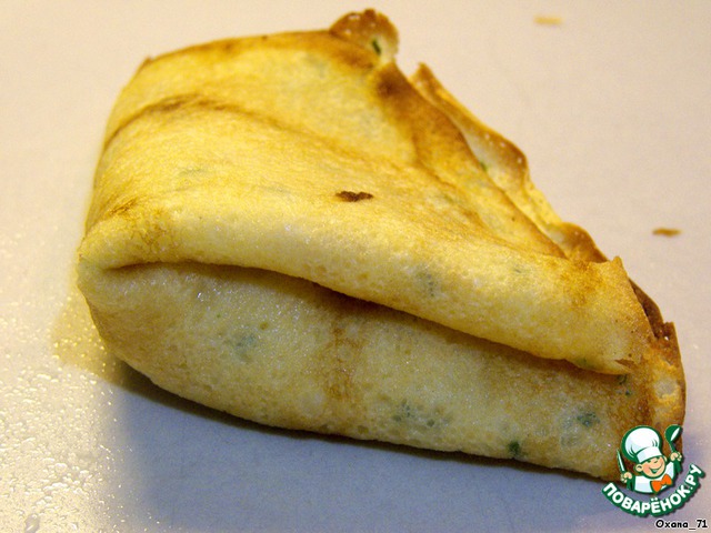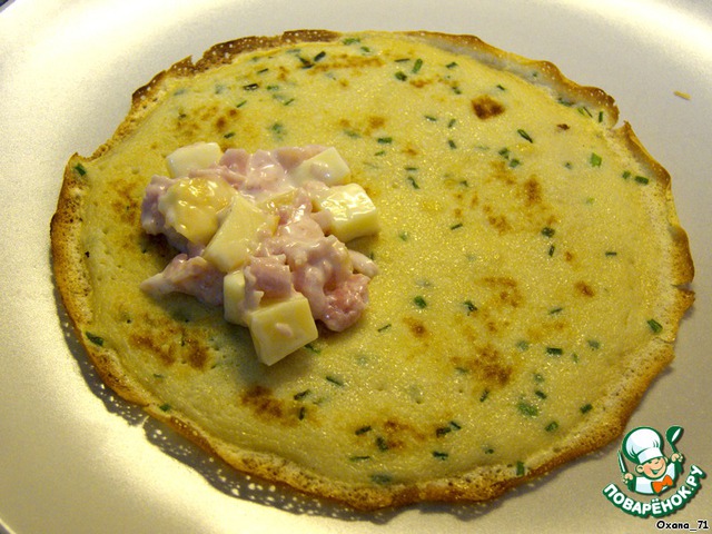 Берём блинчик, переворачиваем его, на 1/4 часть выкладываем начинку.