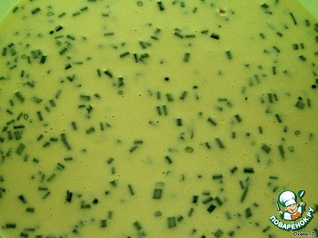 Я замесила тесто на блинчики, добавила нарезанный зелёный лучок, поставила отдохнуть тесто на 30 минут.