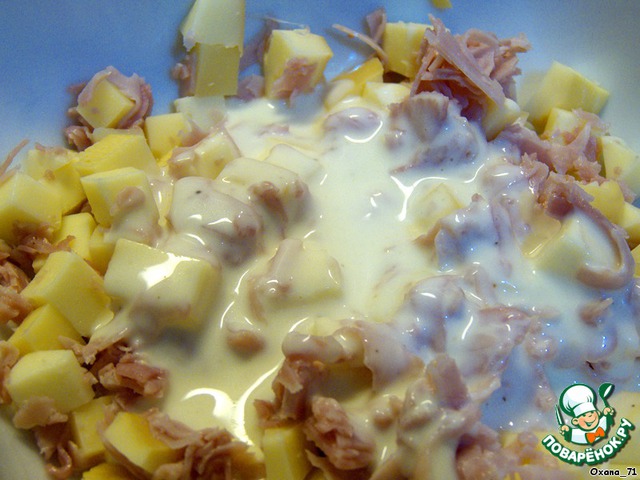 В сыр и ветчину добавим 2-3 ст.л. соуса. Всё перемешаем.