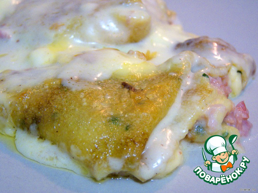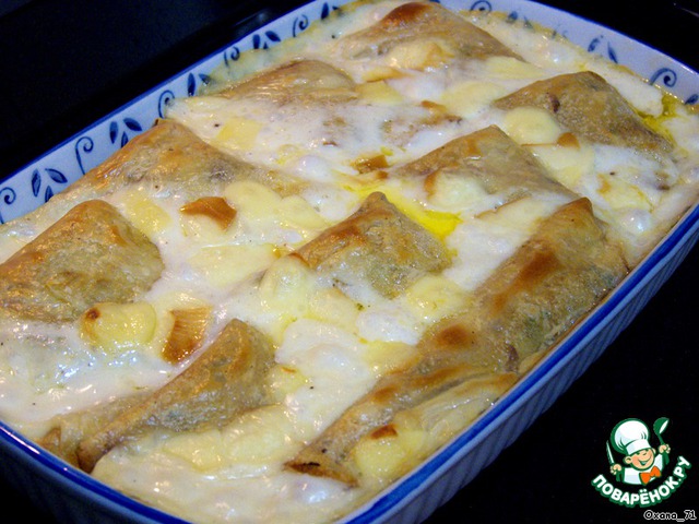 | Креспелли (crespelli) - итальянские фаршированные блинчики, залитые соусом "Бешамель" и запечeнные в духовке. |