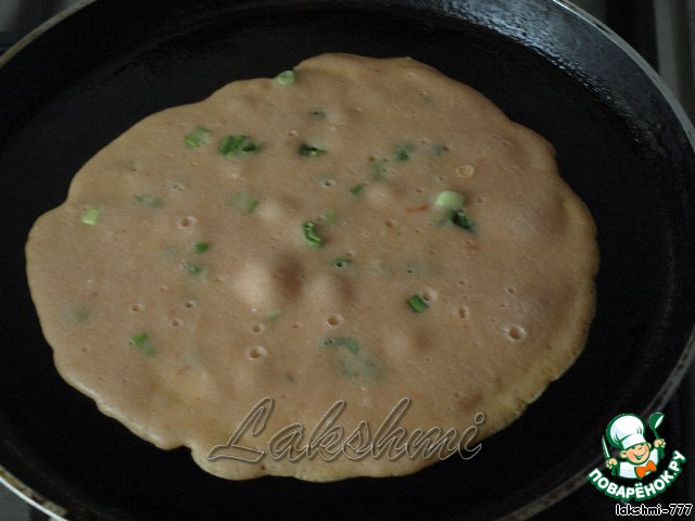 Испечём томатные блинчики - для этого смешаем молоко с томатным соком, солью и сахаром. Хорошо размешаем и постепенно добавим муку. Отдельно взобьём яйца и добавим в смесь. Ещё раз перемешаем. На раскалённую сковороду нальём немного растительного масла, насыпем немного зелёного лука и выльем половник смеси. Распределим равномерно по сковороде. Жарим блинчики по паре минут с двух сторон. Получается 8 штук диаметром 20 см.