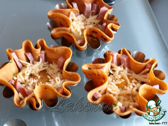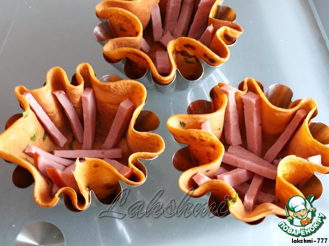 Формочки смазываем растительным маслом и вкладываем в них блины. На дно кладём нарезанную ветчину или шинку. Можно также взять копчёное мясо или бекон.