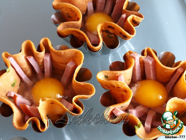 Далее в каждую корзинку аккуратно вбиваем яйцо.