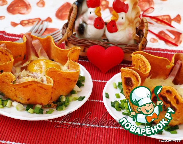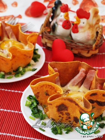 | Я люблю делать своему мужу приятные сюрпризы. Сегодня выходной, вот и решила порадовать его таким вкусным завтраком. Запекла яичницу с ветчиной в духовке под сыром в томатных блинчиках. Очень ароматно, сытно и красиво. Любимый остался очень доволен. |