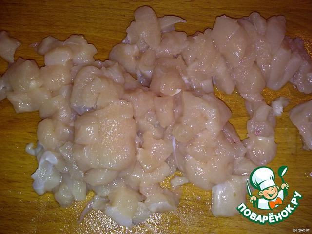 Мелко нарезать куриное филе. Так же добавить в сковороду. Посолить, поперчить, добавить специи (по вкусу), тщательно перемешать. Жарить до готовности минут 10-15.