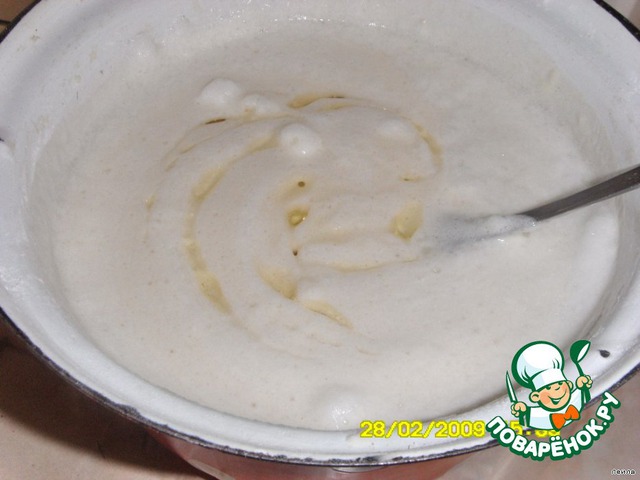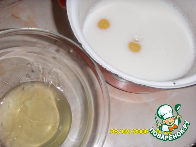 в кастрюлю наливаем теплую жидкость (полпорции), кладем желтки, взбиваем