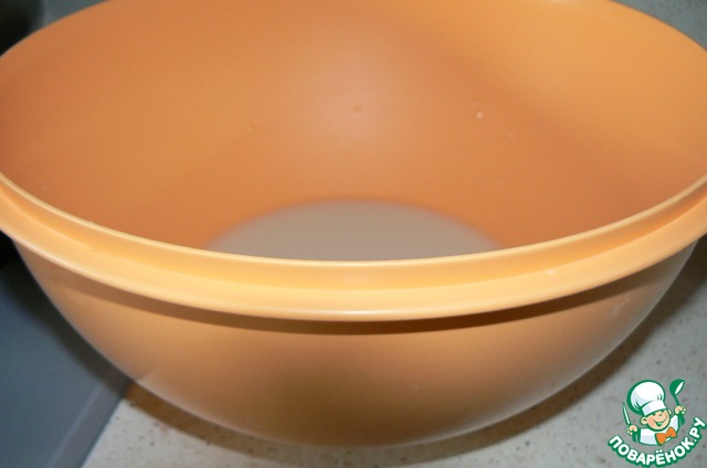 Поставте опару, для чего влить в посуду (у меня на фото замесочное блюдо на 7 литров) 2 стакана теплой воды, развести дрожжи. Я использую свежие дрожжи.