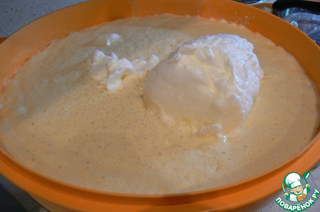 После того, как тесто поднялось два раза необходимо добавить взбитые в пену яичные белки и аккуратно перемешать.