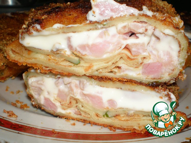 Каждый блинчик обмазать яйцом, обвалять в сухариках. Обжарить на растительном масле.
