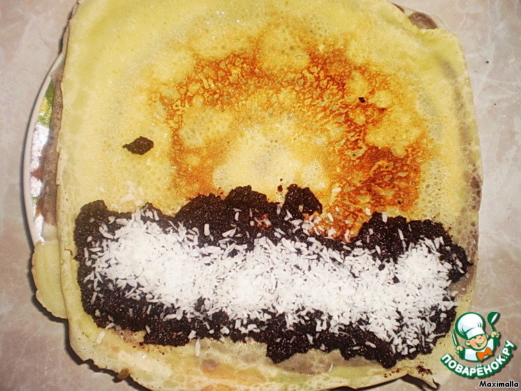 Мак аккуратно процедить, тщательно измельчить с сахаром и 1 ст.л. кипятка в блендере около 5 минут. Масса не должна быть ни сухой, ни жидкой. 1 ст.л начинки выкладывать на край готового блинчика. На белую его сторону! Сверху притрусить кокосовой стружкой.