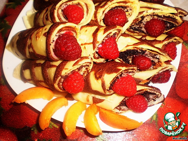 | Тонкие блинчики с узорами из темного теста и с маково-кокосовой начинкой. Мягкие, не сухие, тают во рту.. ММММ, а еще эти легкие шоколадные нотки... |