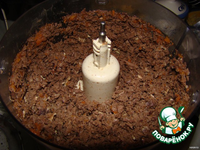 Лук обжариваем на растительном масле и пропускаем вместе с тушеным сердцем и морковью через масорубку (или измельчим в фарш в комбайне)