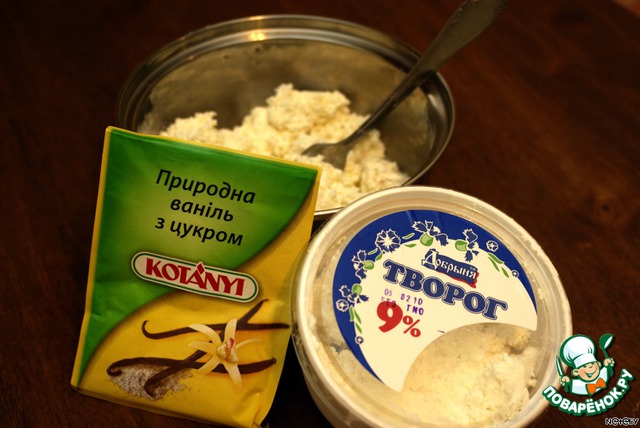 Делаем начинку: творог + пудра + ванилин = растереть. Можно использовать готовую массу.