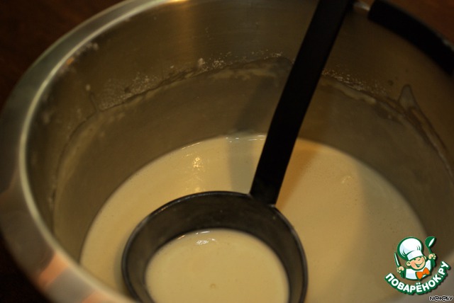 Затем добавляем соду, раст. масло. Тесто запузырится и станет очень воздушное + мука (до состояния густой сметаны).