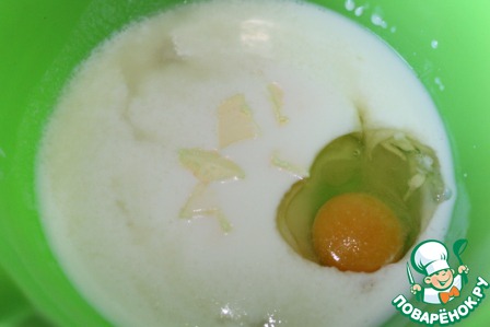 Немного подогреть кефир, добавляем в него сливочное масло (размягчённое), яйцо, сахар и ванилин, взбиваем.