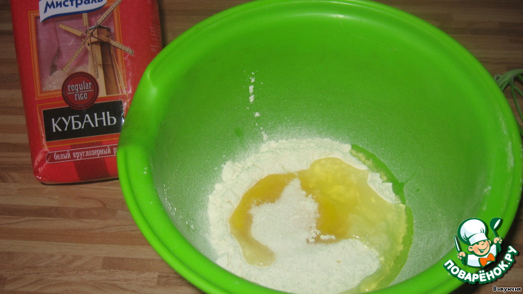 В муке сделать углубления, добавить яйца, соль, 2 ст.л. сахара. Медленно перемешиваем.