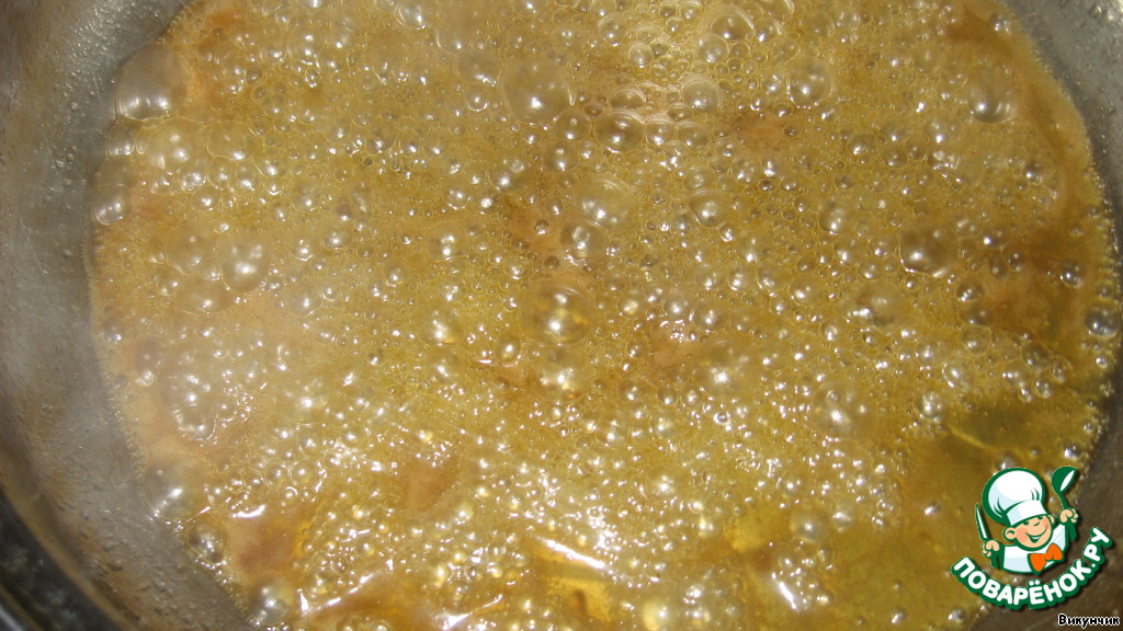 Растопить 2 ст.л. масла и 2 ст.л. сахара в сковороде на сильном огне, пока сахар не превратится в карамель, добавляем апельсиновый сок и доводим до кипения.