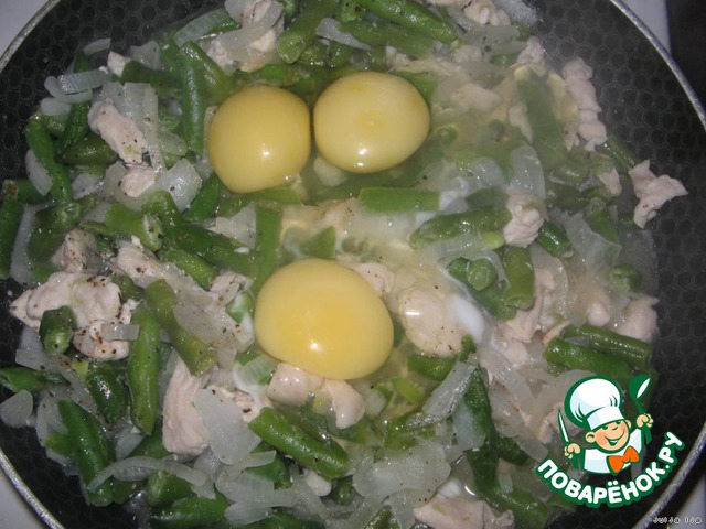 Обжарить до готовности лука и добавить три сырых яйца.