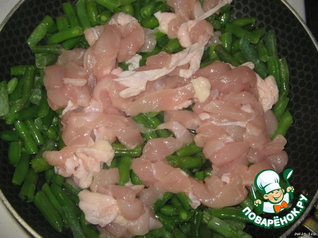 Почти сразу к фасоли добавить куриное филе, нарезанное соломкой.