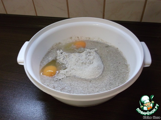 Гречневую муку просеиваем, добавляем обычную минеральную воду с газом, 2 яйца, слегка посолим.