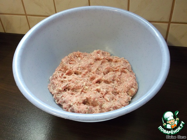 В фарш, сдобренный ароматными специями, добавляем лук и 60 гр тёртого сыра. Тщательно вымешиваем, подливая пару ложек обычной холодной воды. Вместо воды я подливала кефир, мне кажется такое сочетание более гармоничным, хотя, можно и йогурт или сметану. Фарш становится более сочным.