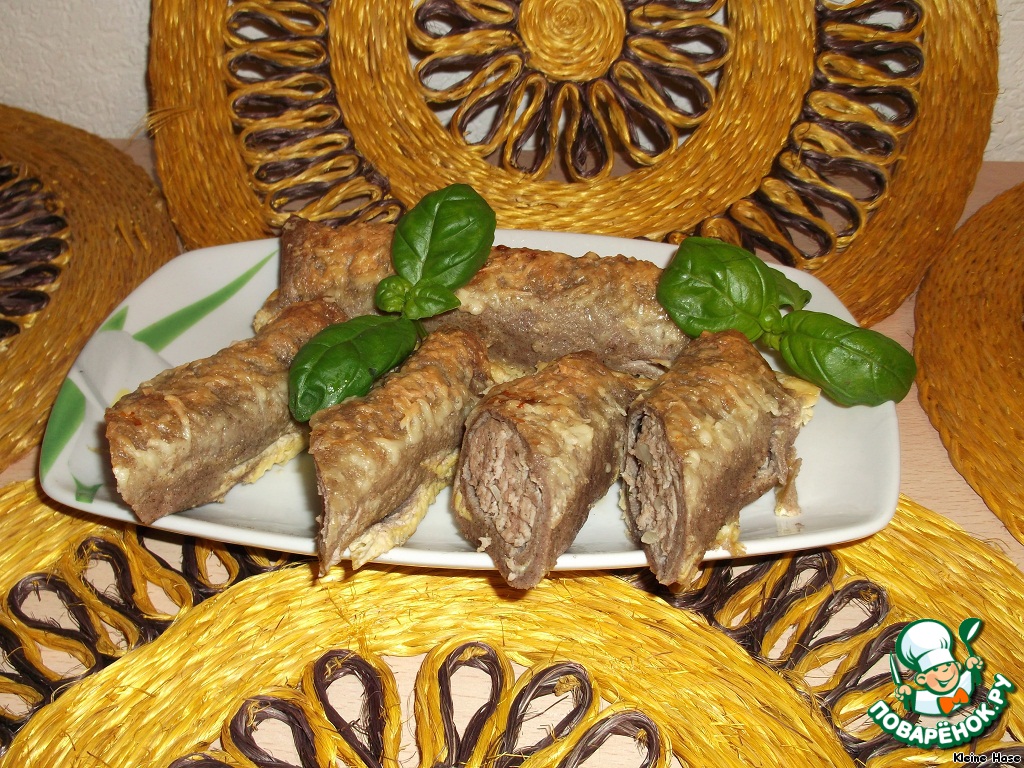 На рабочую поверхность (разделочную доску) кладем блинчик, сверху - 1/8 нашего фарша и просто валиком заворачиваем.