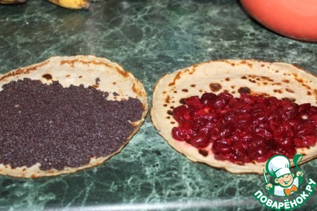 Начиняем три блинчика маковой начинкой и три блинчика вишнёвой начинкой, начинку лучше распределять до чуть больше половины блинчика, чтобы удобнее было сворачивать в трубочку.