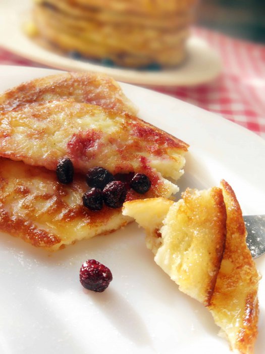 Перед выпечкой, в тесто добавить взбитые в пену белки и растительное масло. Выпекать на раскаленной сковороде.