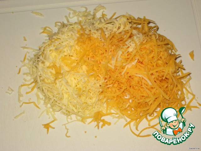 Сыр натереть на мелкой терке. Я брала два вида твердого сыра.