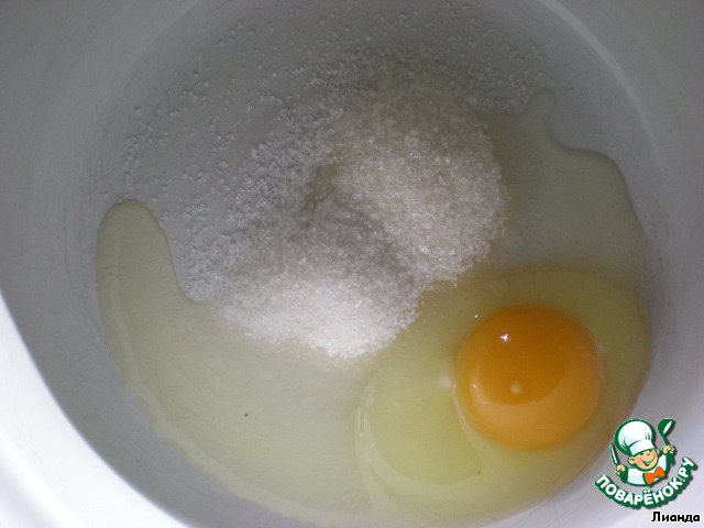 Для приготовления блинов нам нужно взбить одно яйцо со щепоткой соли, столовой ложкой сахара и ванильным сахаром.