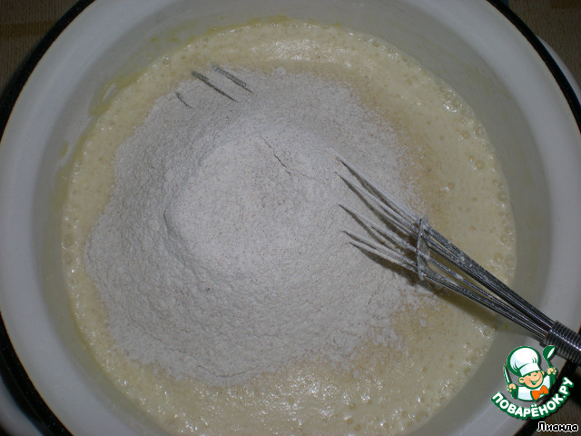 Добавить остальное молоко, размешать. Всыпать ржаную муку и разрыхлитель. Скажу вам честно, в этом случае я вместо разрыхлителя взяла по половине чайной ложечки соды и лимонной кислоты, по четверти чайной ложечки муки и крахмала. Хорошо перемешала и эту смесь всыпала в тесто.