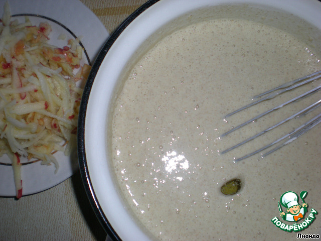 Влить 50 мл растительного масла и добавить натертое на крупной терке яблоко. Ложкой хорошо размешать и приступать к выпечке блинов.