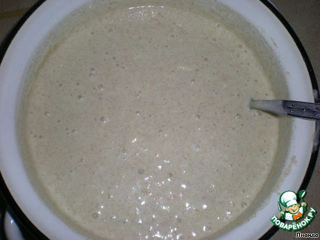Тесто должно получиться в меру густым. Но немного гуще, чем на блины.