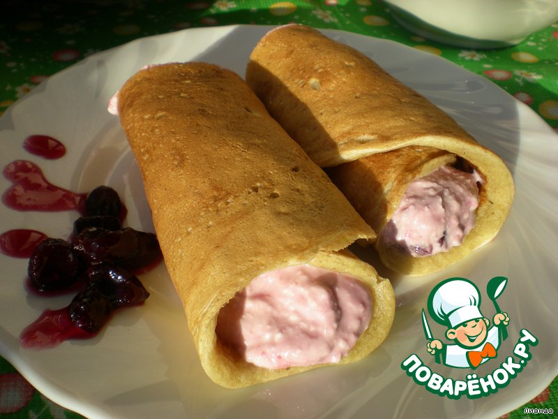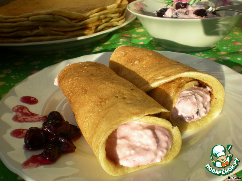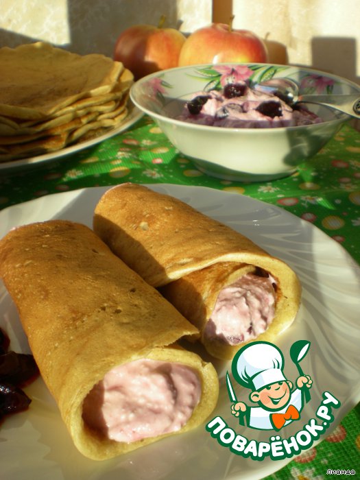Их можно подавать с творогом, взбитым блендером и перемешанным с вареньем. У меня варенье из крыжовника. Варенье добавляйте по вашему вкусу.