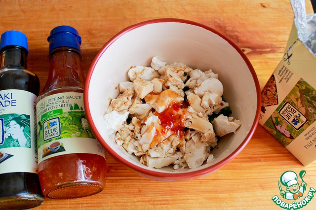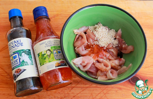 Филе маринуем в соусе терияки, добавляем сладкий чили соус, и семена кунжута.