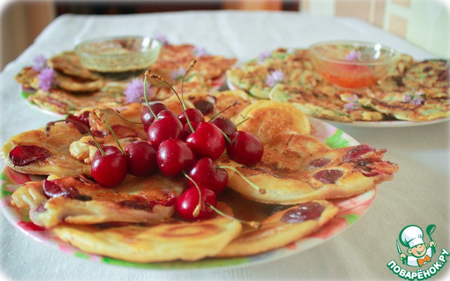 Для любителей фруктов приготовим фруктовые блинчики с бананом и свежей вишней.