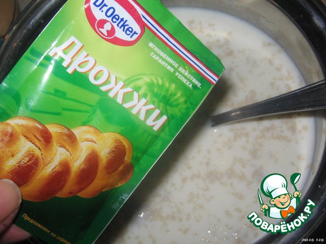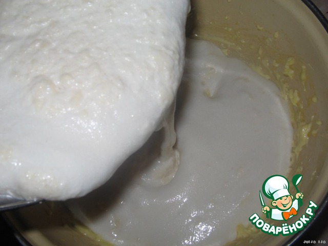 Опару оставляем на 10-20 минут подниматься. Время подъёма зависит от дрожжей, у меня за 10 минут поднялась.