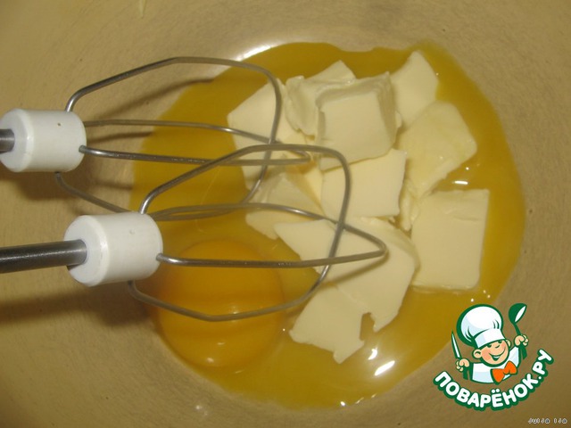 Совсем забыла. Перед тем, как выпекать, нужно добавить в пену взбитые белки (они у нас в холодильнике стояли).