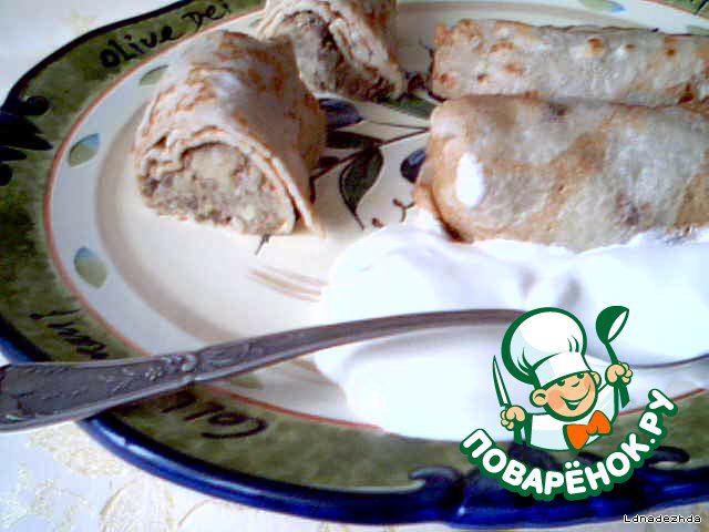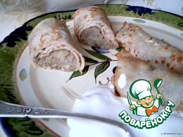 Готовим блины.У меня скороспелые(бездрожжевые),но можно любые.Я брала 1.5 стакана молока,1 яйцо,просеянную муку,соль,сахар,1 лож.раст.масла.Смешать до густоты жидкой сметаны.Выпекать на растительном масле.
