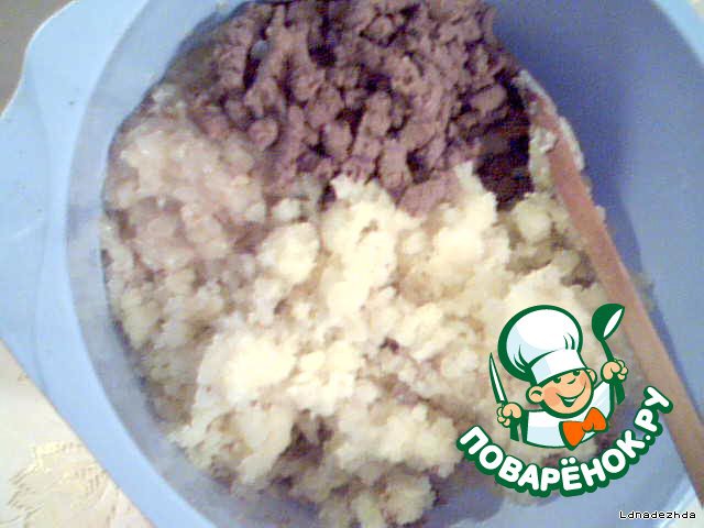 Отварной картофель размять,печень и лук без масла пропустить через мясорубку(у меня крупная решетка).Все смешать,добавить масло,в котором пассеровался лук,посолить по вкусу.