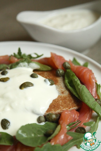 Для подачи разложите блины по подогретым тарелкам, сверху аккуратно уложите ломтики копченый семги, добавьте сметану, немного каперсов и салатных листьев, немного полейте оливковым маслом и по желанию приправьте молотым перцем.