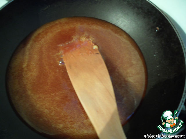 Здесь нужно внимание - температура должна быть постоянной, снимать сковородку с огня нельзя, сахар моментально кристаллизуется. Сахар должен приобрести коричневатый цвет, но и пережаривать тоже нельзя, иначе будет вкус пережжённого сахара.