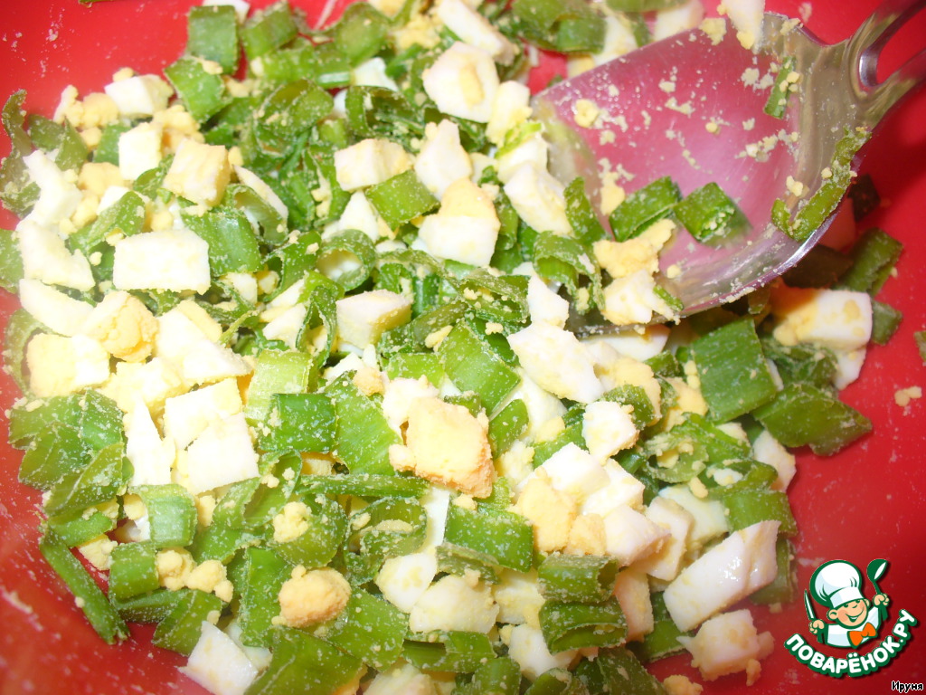 Одно яйцо отвариваем вкрутую (10 минут с момента закипания), охлаждаем в холодной воде, очищаем от скорлупы и режем мелкими кубиками. Зеленый лук моем, обсушиваем бумажными полотенцами и режем мелкими колечками. Аккуратно смешиваем с яйцами, немного присолить.
