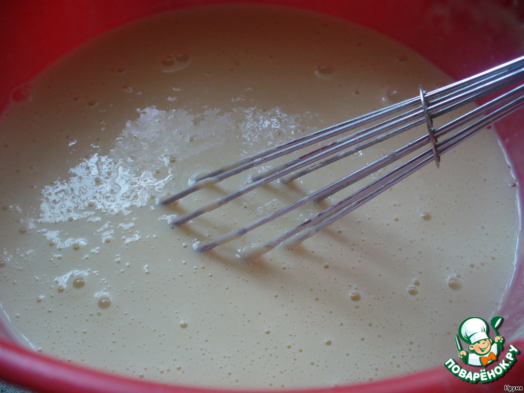 Готовим жидкое тесто для блинов. По любому рецепту. Я делаю следующим образом - яйца взбиваю венчиком, добавляю воду, соль и сахар, взбиваю, и постепенно добавляю муку до состояния достаточно густого теста (консистенция сметаны), мешаю венчиком, постепенно добавляю молоко, доводя тесто до консистенции жидкого блинного теста. Добавляю примерно 1 ст. л. растительного масла, перемешиваю. Тесто готово. Более точных пропорций продуктов дать не могу, т.к. всегда делаю на глаз, да и кол-во муки варьируется (например, от размера яиц). Просто надо приспособится, что очень легко.